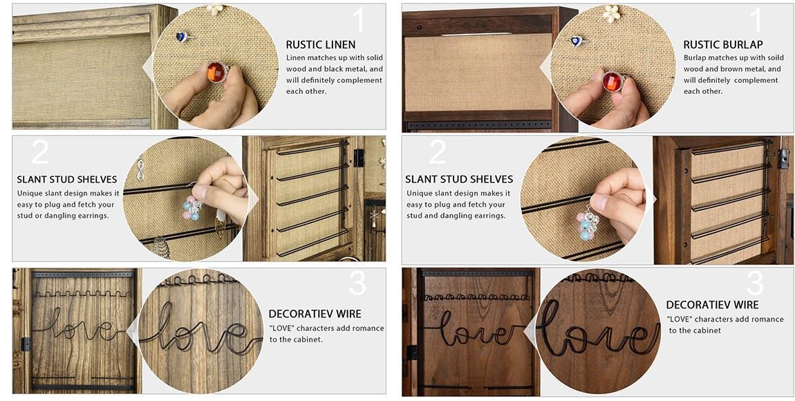 ভিনটেজ জুয়েলারি অর্গানাইজার - শক্ত কাঠ, বার্ল্যাপ এবং কালো ধাতু একে অপরের পরিপূরক আপনার ক্যাবিনেটকে একটি ভিনটেজ লুক দিতে যা অবশ্যই আপনার ঘরের সাজসজ্জার পরিপূরক হবে।